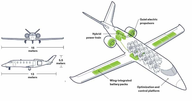 The aircraft has three batteries powering three motors that will deliver 750kW to spin the propellers. Each 72 kilowatt-hour battery pack weighs 450kg and has 6,000 densely packed lithium-ion cells.